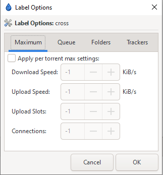 Below you see an example of the bandwidth options available for a specific label. These settings will be automatically applied as long as a torrent has this label.