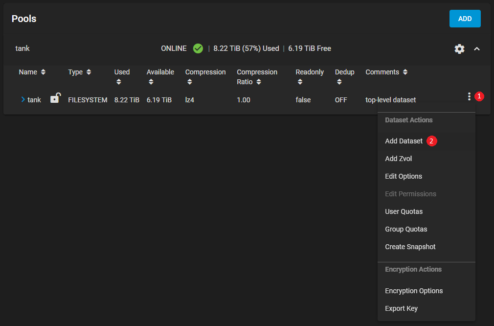 This guide assumes that you've already created a pool, which by default will contain a top-level dataset that was configured during the time of pool configuration. For the examples below, we'll be using a pool name of tank