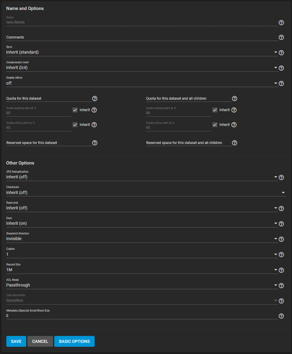 . This provides a performance increase on a dataset that will primarily be handling media files. Optionally, you can configure Quota for this dataset