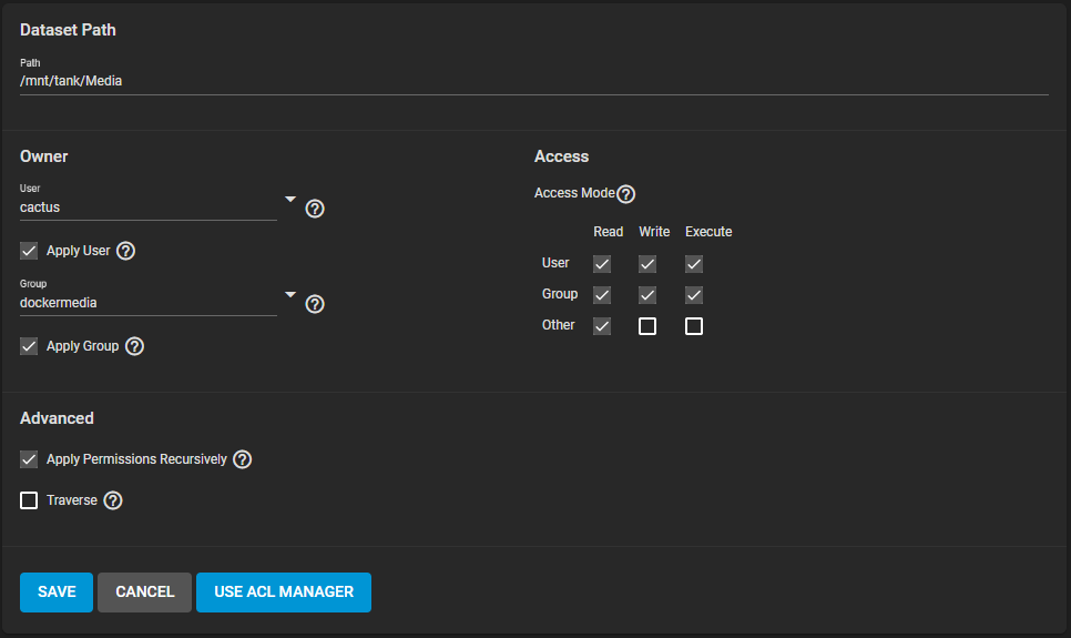 These subfolders you need to create yourself using your preferred method. Set your permissions accordingly as well. If you use ACLs on the datasets you can replicate the usual 775/664 (UMASK 002) or 755/644 (UMASK 022) recommendation, but this guide only covers the use of basic permissions for mounting and expects the end user to fine-tune permissions via chmod, chown, and uid/gid/umask settings on the applications that will be utilizing the share.