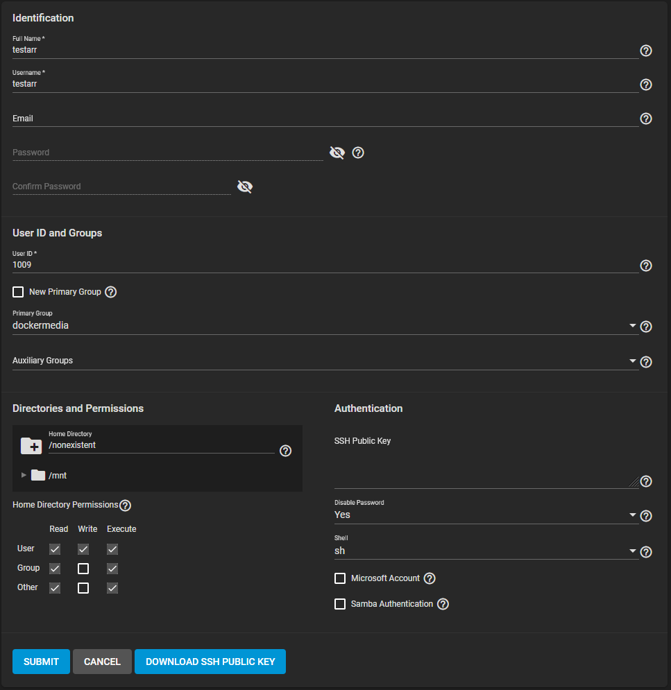 We'll need to create a user (or users - if you're using individual user accounts for each service) on TrueNAS that matches the user and UID of the user you'll be mounting your share with. It's important that these match since we're not using the Mapall