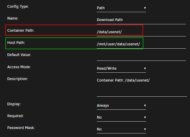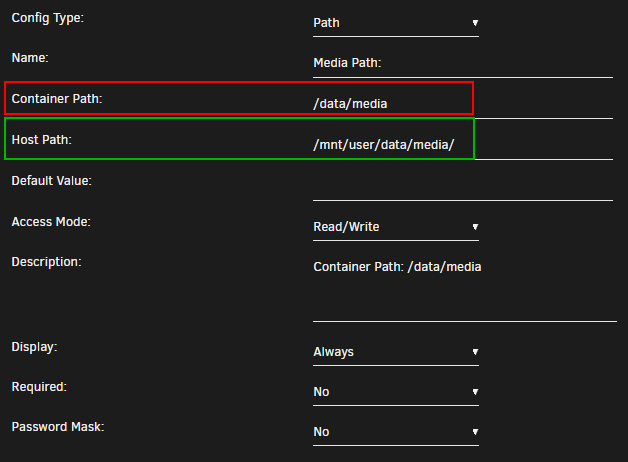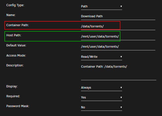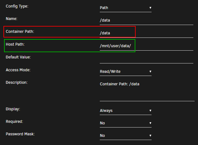 unRAID makes it pretty clear which is the Host Path and Container Path.