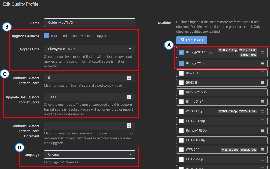 - Dual Audio: If you want to have Dual Audio releases (original and English audio) in case Radarr does not find a VOSTFR or MULTi release.
