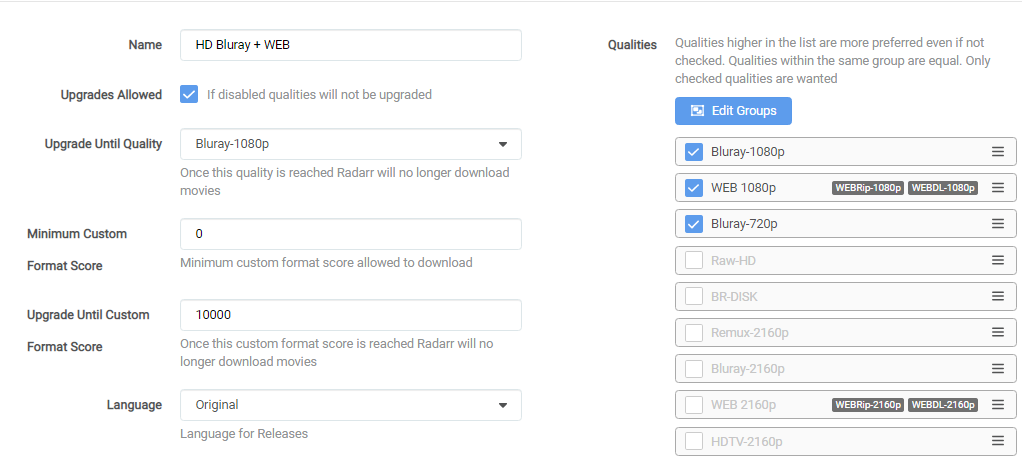 The following Quality Profiles can be combined into a single Quality Profile if you, for example, want to be able to upgrade from 1080p to 4K/2160p when and if it becomes available AFTER the 1080p release is made.