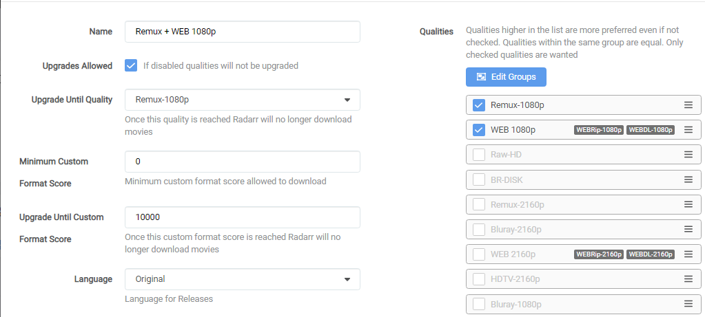 means no upgrades will happen based on Custom Formats) - Your preferred language profile for your releases. (Original is recommended)