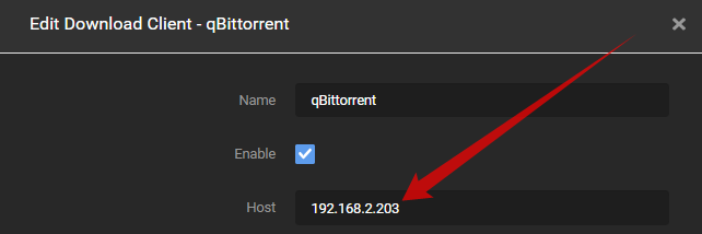 To find what you need to put in your host you navigate in Sonarr to the Settings => Download Clients Tab. There you open up the download client for this example we will be using QBittorrent