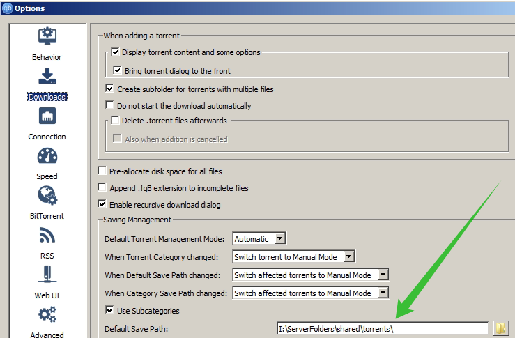 In QBittorrent navigate to Tools => Options (or ALT+O) and navigate to the Download settings.